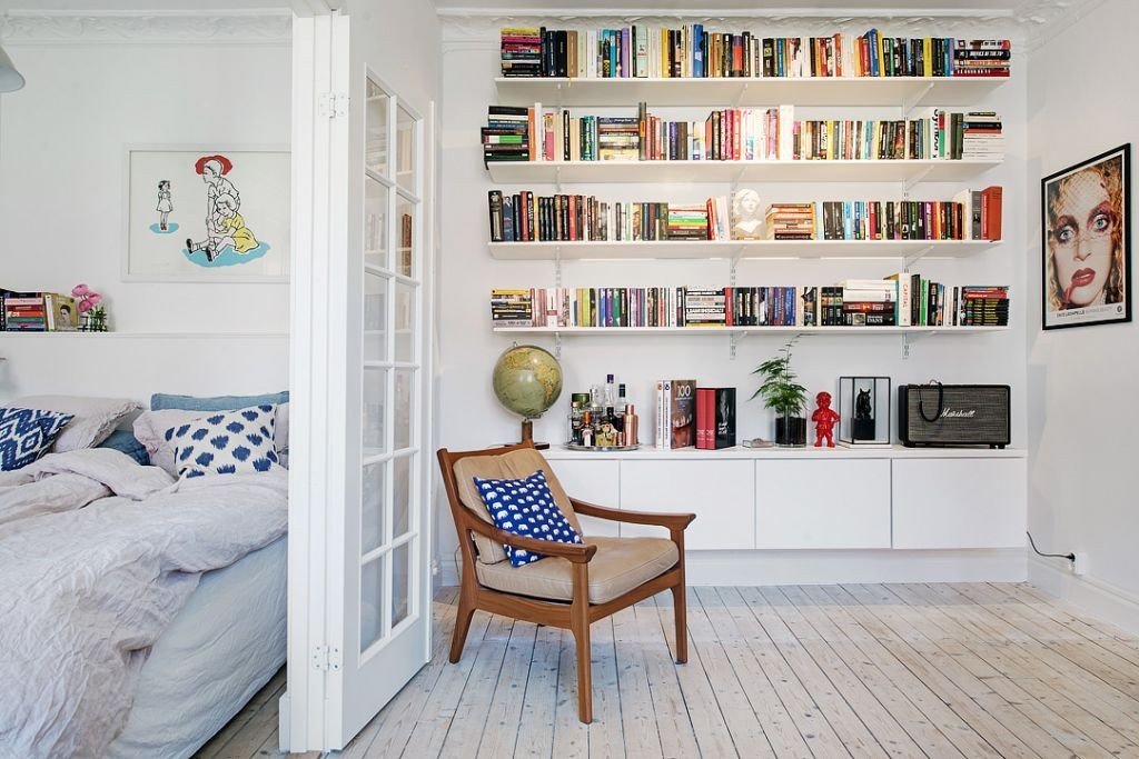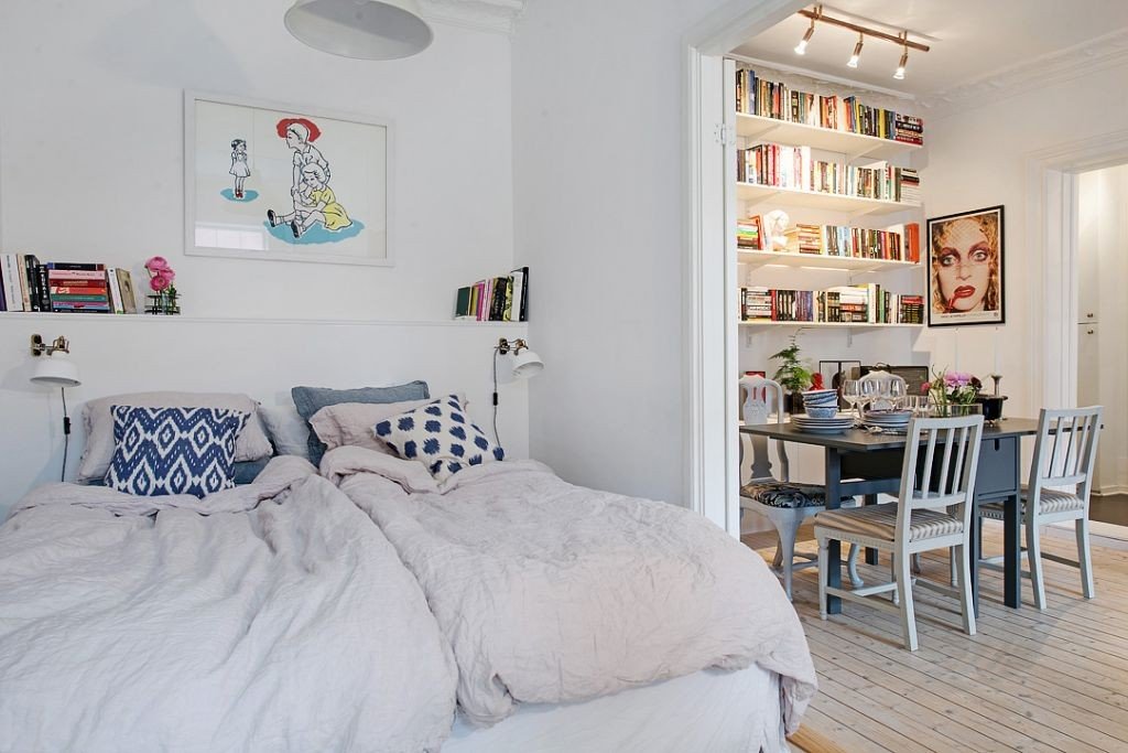 В гостиной также есть обеденный уголок, а стены украшены полками с книгами. Белые стены также являются хорошим фоном для картин, висящих на них.