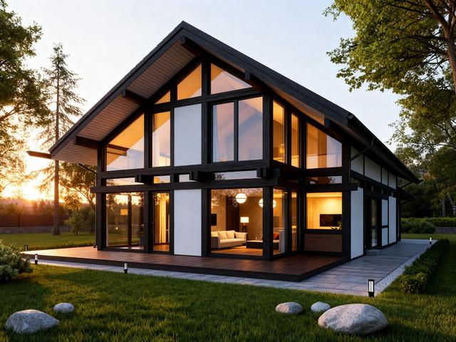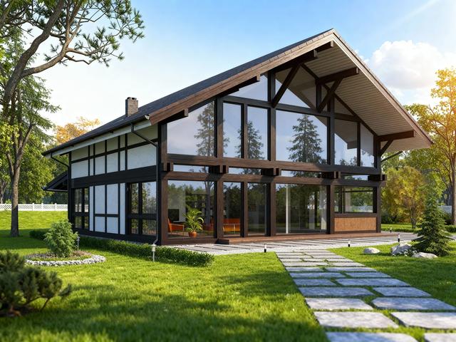 Современные фахверковые дома строятся на прочном деревянном каркасе из клеёного бруса, который виден снаружи и выдерживает значительные нагрузки. Промежутки каркаса заполняются панорамными окнами или многослойными энергосберегающими панелями с утеплителем. Для остекления используются закалённые двойные или тройные стеклопакеты с аргоном и селективным покрытием, обеспечивающие высокую теплоизоляцию и безопасность.